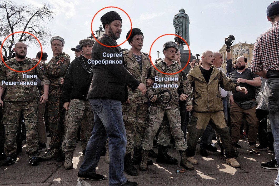 UPD: Уже после выхода нашей статьи бдительные читатели помогли нам идентифицировать ещё нескольких псевдо-казаков, избивавших мирных протестующих на Пушкинской площади.
